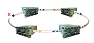 The Dual IP Ring topology provides inherent redundancy. Each CCP transmits its IP packets in both directions on the ring simultaneously, clockwise and counter-clockwise, effectively creating two IP networks. In case of a malfunction in a segment of the ring the system continues to operate normally without any degradation, as illustrated above, right.