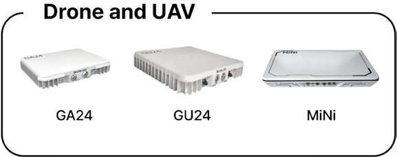 GA24 (Ka-band) is a high-gain ESA antenna optimized for small UAVs, supporting GEO satellite communication. Field tests in the Middle East verified 1 Mbps uplink performance. Through OpenAMIP protocol integration, GA24 supports real-time pointing and dynamic link management during flight.