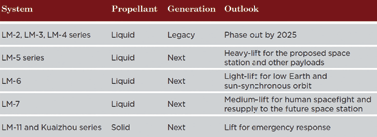 China has a robust fleet of launch vehicles to support its requirements. The Chang Zheng, or Long March, and Kuaizhou SLVs can launch Chinese spacecraft to any orbit.