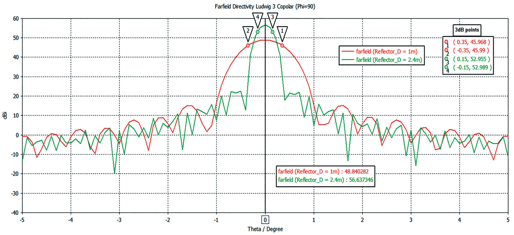 Figure 1. Transmit antenna gain patterns for a 1 meter (red) and 2.4 meter (green) parabolic antenna about boresight, with the 3-dB points at 30 GHz, indicated by markers. Click on the chart for an expanded view.